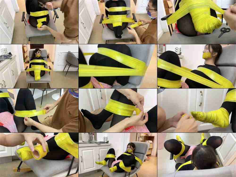 28467 缚艺录 小柯 黑丝、黄色胶带,绿色胶带的捆绑,与粉色胶带的缠绕头部
