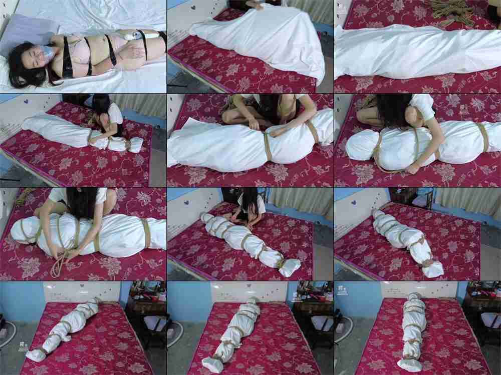 小姐姐天降横祸被歹徒入室胶带捆绑丝袜塞嘴透明胶带封嘴/乳夹/跳D/棒棒固定折磨!再被白床单包裹绳子紧缚呼吸困难!难受的挣扎求救!